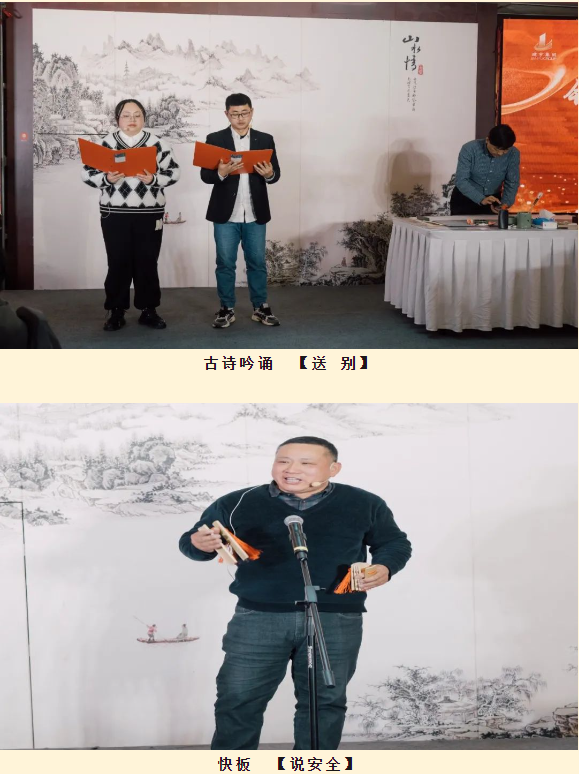 詩(shī)朗誦《筑夢(mèng)之路》、古詩(shī)吟誦《送別》、小品《查抽煙》、快板《說(shuō)安全》、口琴獨(dú)奏《女兒情》、大合唱《大中國(guó)》、《明天會(huì)更好》、獨(dú)唱《攙扶》等元素多樣、精彩紛呈的節(jié)目把年會(huì)氣氛不斷推向高潮,贏得全場(chǎng)熱烈掌聲與喝彩。